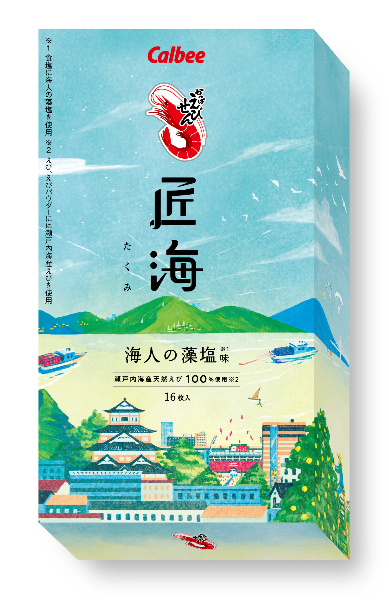 かっぱえびせん匠海 / カルビー株式会社 広島みやじま工場 瀬戸内海産の天然えび(※)をまるごと贅沢に使い、1枚1枚丁寧に焼き上げています。広島うまれのこだわりのかっぱえびせんです。 ※えび、えびパウダーには瀬戸内海産えびを使用。
